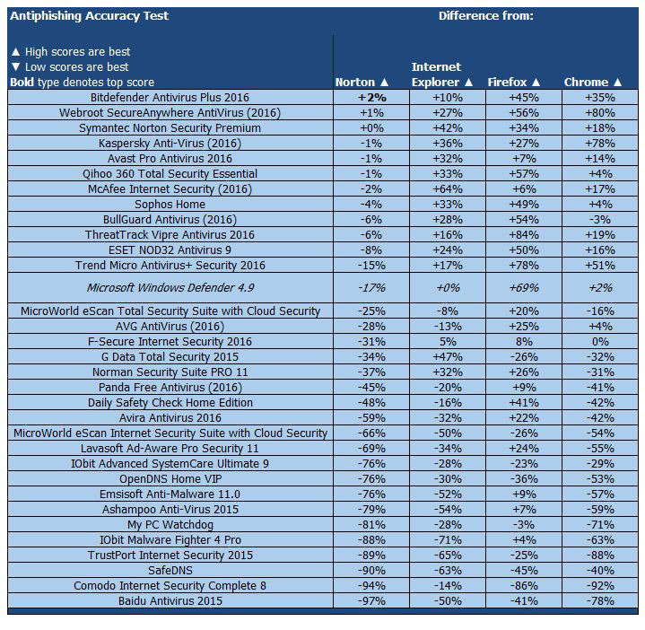 На протяжении нескольких последних тестов прослеживается тенденция: Internet Explorer улучшает показатели, Chrome держится стабильно, а Firefox сдает позиции. После подсчета результатов оказалось, что уровень обнаружения Microsoft оказался на 17 процентов ниже, чем у Norton. Этот результат лучше у большинства протестированных продуктов, хотя Avast лишь один процент уступил Norton. Microsoft превзошел Chrome на 2 процента.