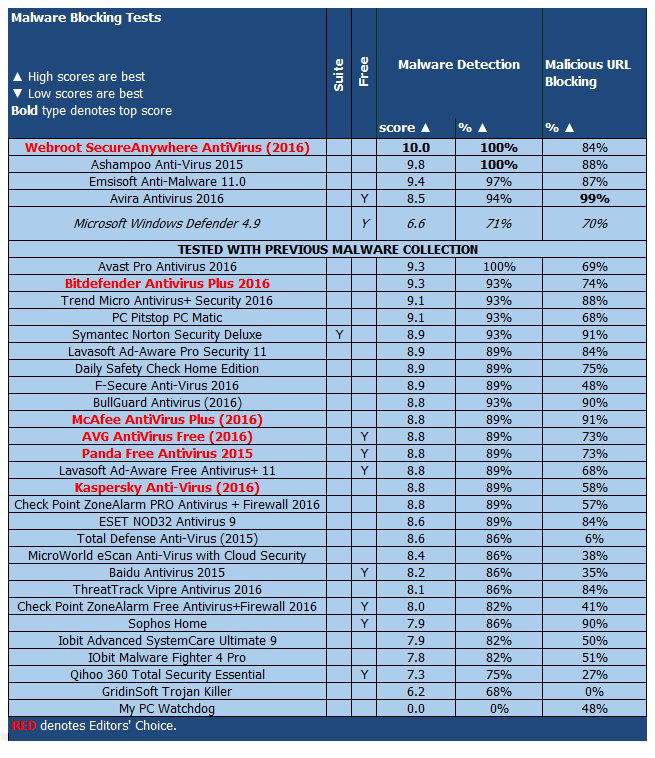 AV-Comparatives тоже рассматривает Microsoft в качестве базового уровня, исключая продукт из итоговой таблицы, но добавляя примечания в отчете с показателями Защитника. В пяти отслеживаемых тестах Microsoft прошел одно испытание с рейтингом Standard и остальные с Advanced.