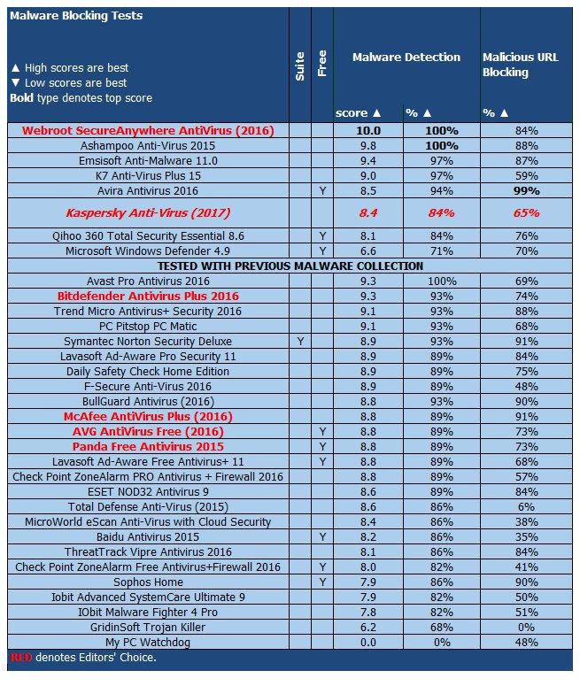С этого года PCMag отслеживает результаты тестирований MRG-Effitas. Kaspersky и Webroot SecureAnywhere AntiVirus (2016) стали одними из немногих продуктов, которые смогли пройти тест на блокировку финансовых вредоносных программ в этой лаборатории.