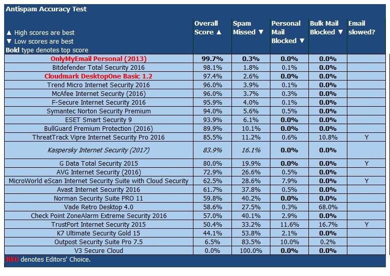 Как ESET NOD32 Smart Security 9 и BullGuard Internet Security (2016) комплексный антивирус Касперского не заблокировал ни одно надежное личное сообщение. Тем не менее, продукт проигнорировал 16,1 процентов спама - это в два раза больше, чем предыдущая версия.