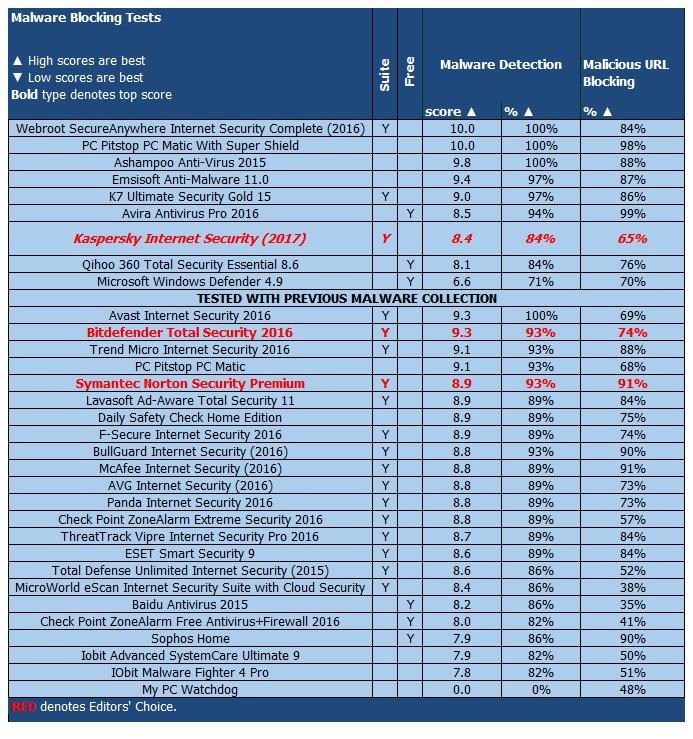 В тестах PCMag на блокировку вредоносных программ Kaspersky показал себя хуже, заработав только 8,4 баллов из 10 возможных. Наивысший результат среди антивирусов, протестированных с идентичной коллекцией угроз, принадлежит Webroot SecureAnywhere Internet Security Plus (2016), который заработал максимальные 10 баллов. В тесте на блокировку вредоносных загрузок проверяется эффективность противостояния сайтам с вредоносным содержимым. Kaspersky показал 64-процентный уровень обнаружения, что не сравнимо с 99-процентным показателем Avira Antivirus Pro 2016. Обратите внимание, что, когда лаборатории безгранично нахваливают продукт, их мнению можно доверять. Лаборатории обладают мощными ресурсами и возможностями, а собственные любительские испытания серьезно ограничены.