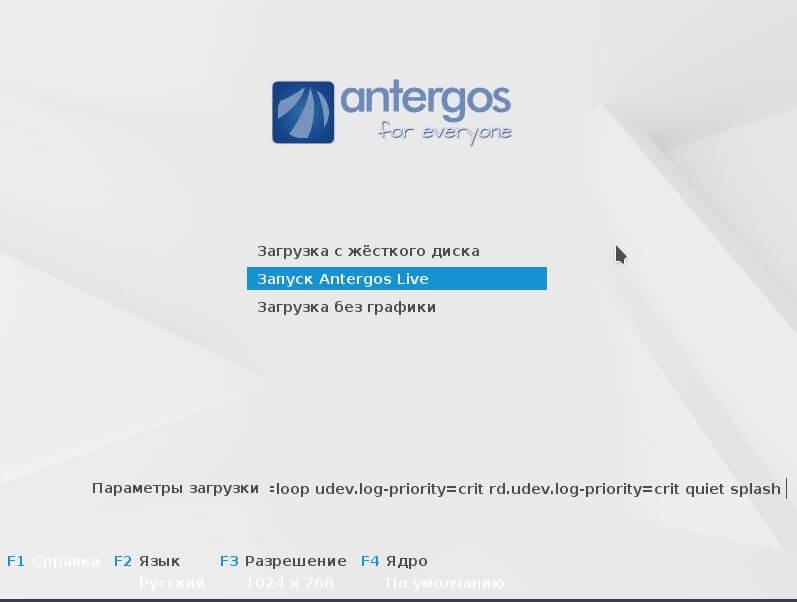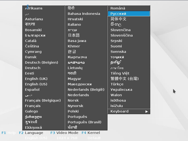 1. Загружаемся с диска. Перед нами загрузочное окно с выбором вариантов загрузки: со съемного носителя в режим LiveCD либо вернутся в режим загрузки жесткого диска. Чуть ниже доступна опция смены локализации загрузочного диска. Нажимаем F2 и выбираем нужный нам язык.