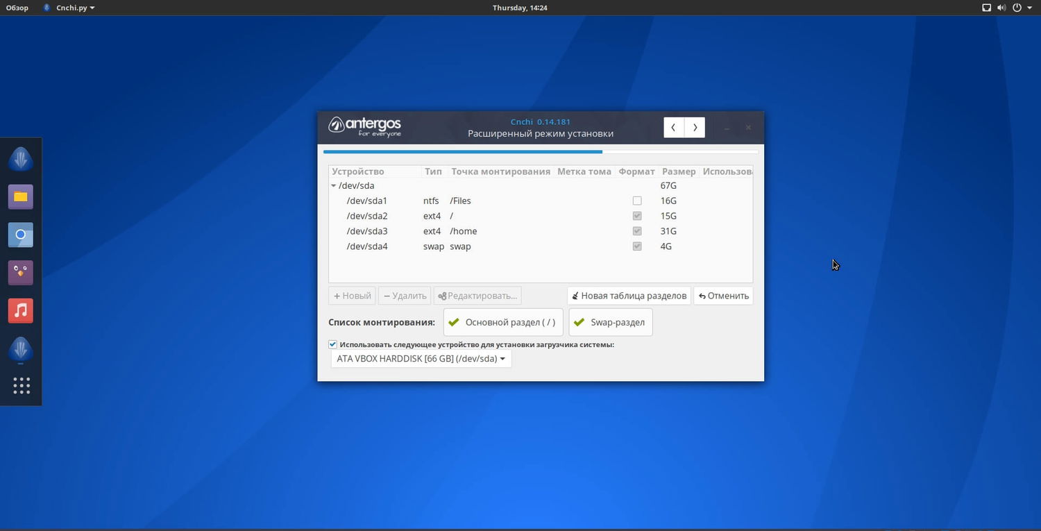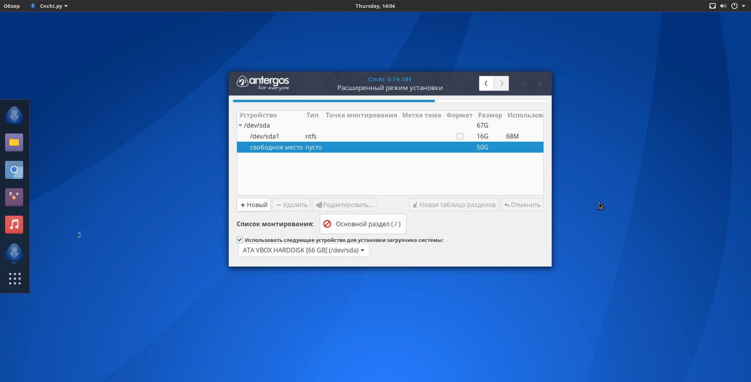 Для установки системы нам нужно будет создать три раздела (корень, домашний раздел и свап), дополнительно рассмотрим монтирование уже созданного ntfs раздела (условный Локальный диск D из отформатированного Windows). Удаляем имеющийся раздел (бывший Локальный диск С). Удаленный раздел или разделы отмечены как Свободное место.