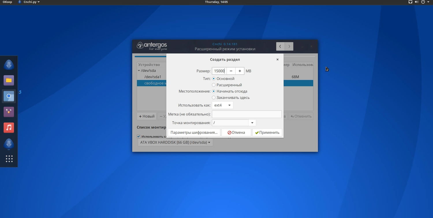 Нажимаем на Новый и создаем раздел для Linux.Первым разделом будет корневой. Выбираем тип файловой системы ext4, точку монтирование - /. Остальное оставляем по умолчанию. Объем рекомендую выбрать от 15 ГБ до 30 ГБ.