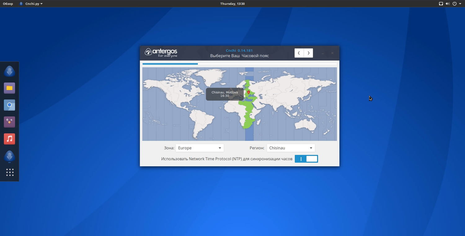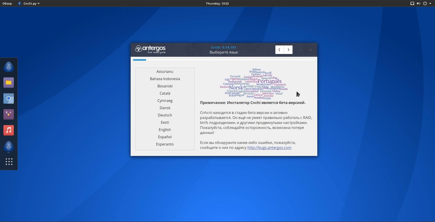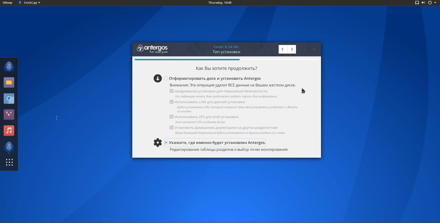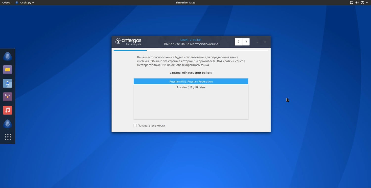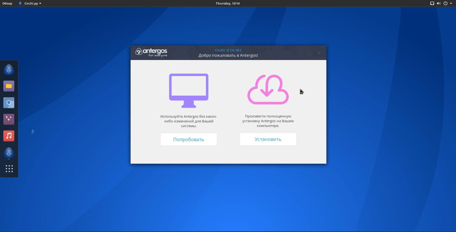 2. Загрузившись с диска видим рабочий стол и фирменную утилиту Cnchi (утилита установки системы). Можем опробовать систему либо сразу приступить к установке. Для тех кто решил попробовать систему, в любой момент можно запустить утилиту установки системы из панели быстрого запуска