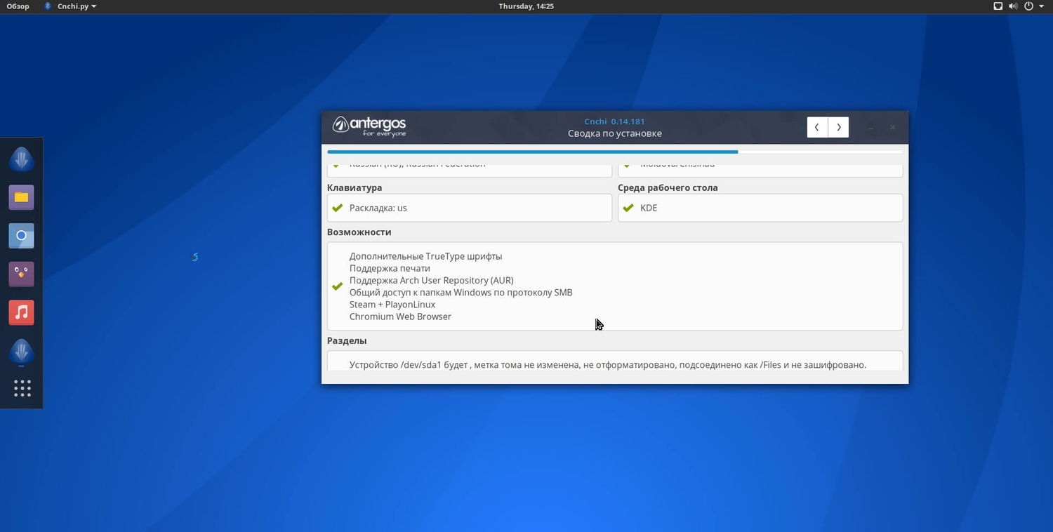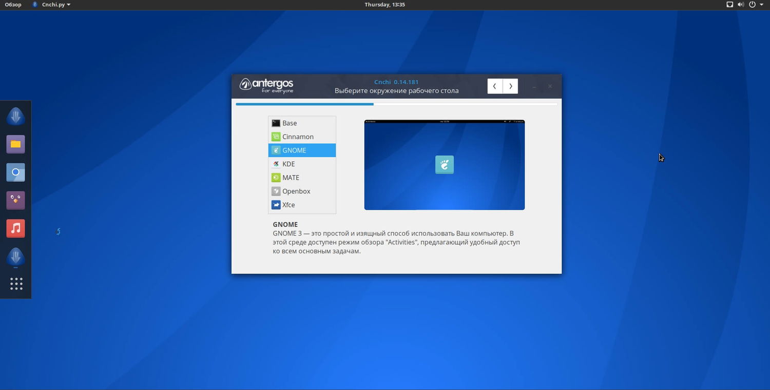 8. Выбор системного окружения. Очень интересная функция, за что разработчикам Antergos отдельное спасибо.По каждому доступному названию рабочего окружения есть краткое его описание. Выбранное окружение будет скачано с сети и автоматически установлено.