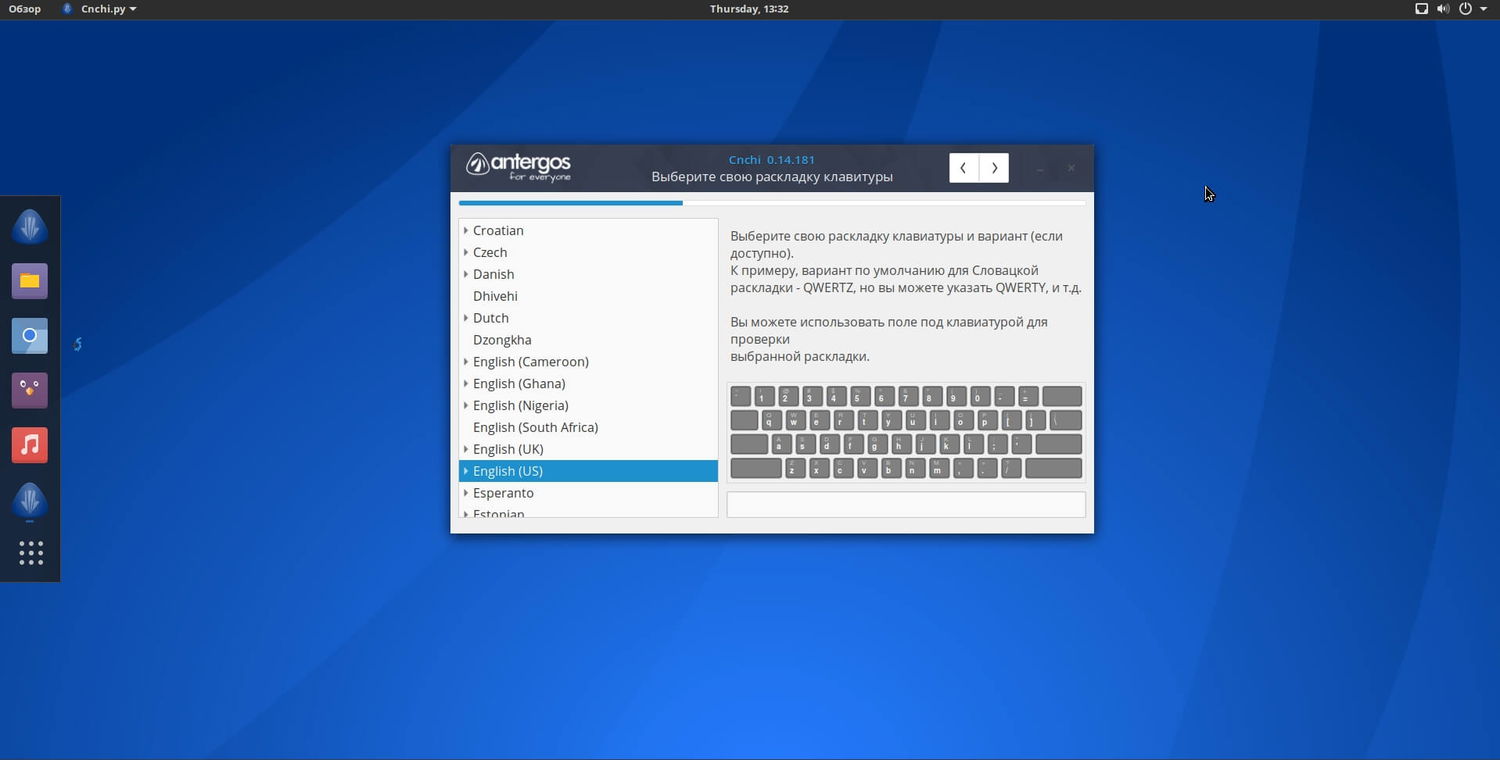 7. Предлагается выбрать раскладку. Для того что бы избежать различные проблемы из-за смены раскладки, рекомендую выбрать английскую раскладку, а уже после установки и загрузки в систему, самостоятельно добавить русскую (или другую) раскладку.
