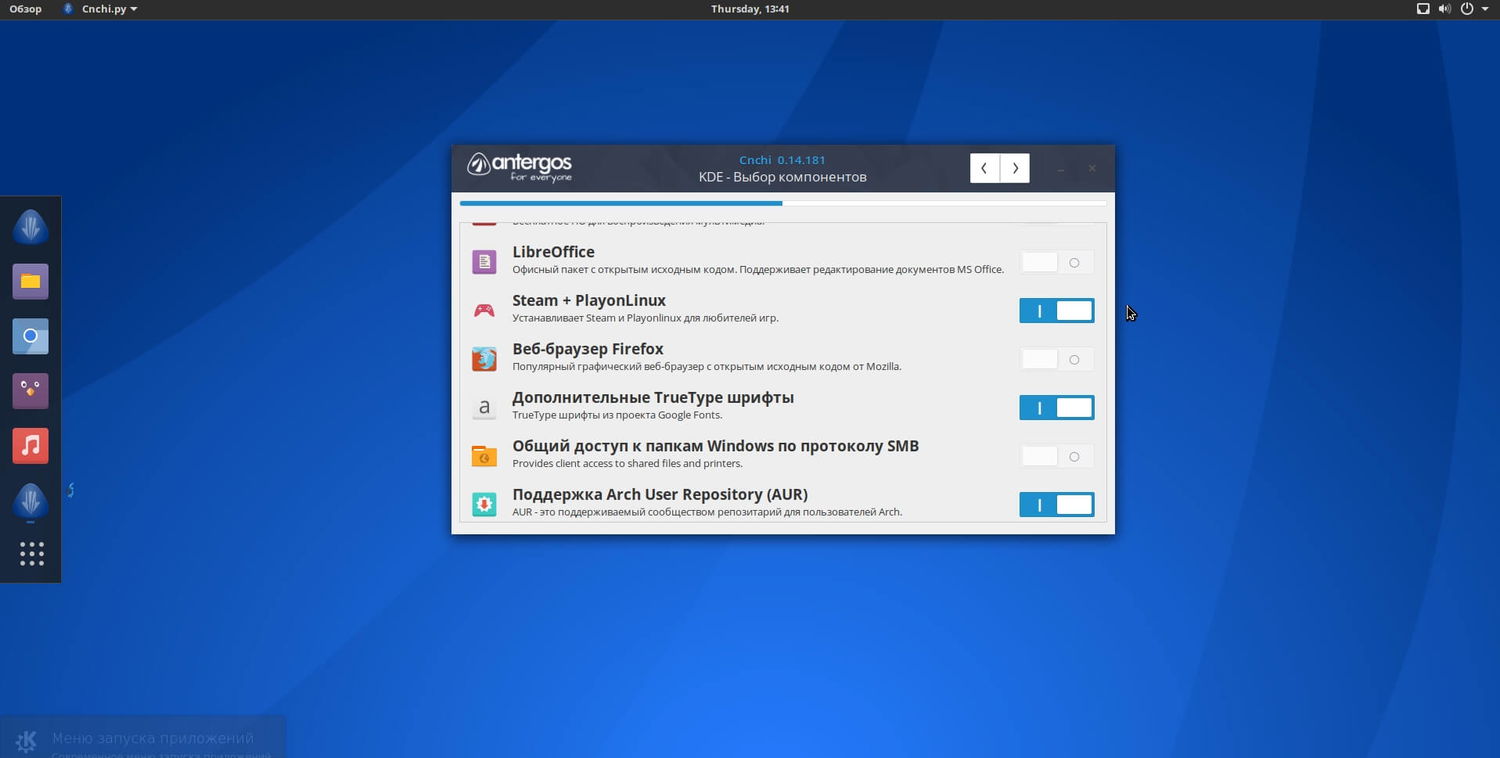 9. Выбираем пакеты. Рекомендую выбрать браузер, Steam (если он нужен), шрифты TrueType, общий доступ к папкам Windows по протоколу SMB, проприетарный драйвер и поддержку Arch User Repository (сокращенно AUR - это огромный пользовательский репозиторий, благодаря которому отпадает необходимость в поиске сторонних репозиториев). Все пакеты как и система, будут установлены самых последних версий.
