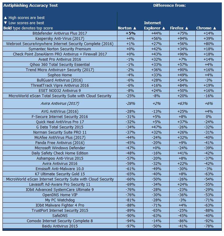 В прошлую сессию тестирования уровень обнаружения Avira оказался на 50 процентов меньше, чем у Norton, что является откровенно слабым результатом. На этот раз Avira распознала на 28 процентов меньше фишинг-угроз, чем Norton и смогла обойти встроенные контент-фильтры всех трех браузеров. В любом случае, отключать встроенную защиты браузеров при использовании Avira не рекомендуется.