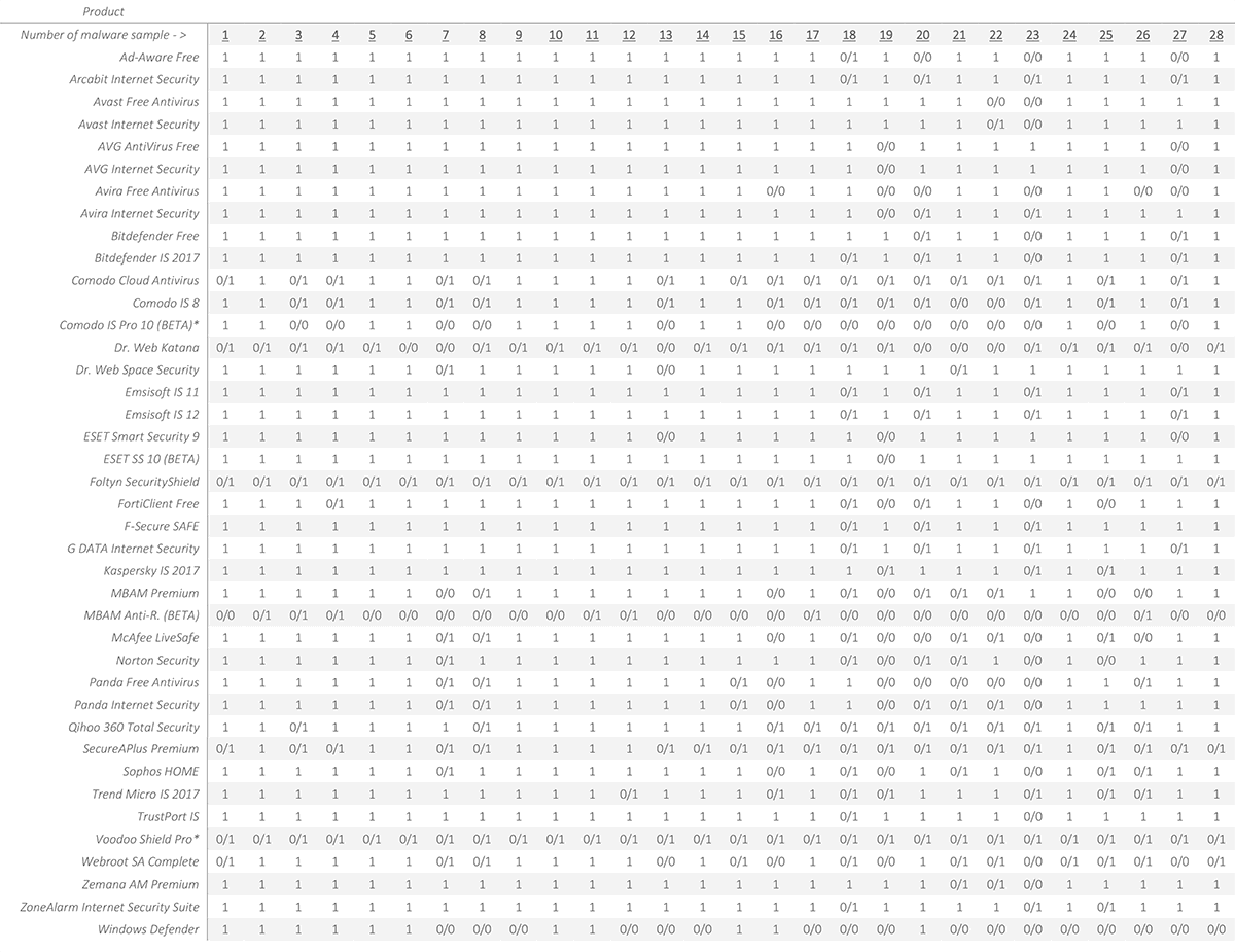 Для того, чтобы соблюсти принципы идентичности испытаний, AVLab решила проводить тест со стандартными настройками продуктов в одинаковой среде тестирования. В тестировании принимали участие известные антивирусные продукты для обычных потребителей и два независимых приложения: Foltyn SecurityShield и Voodoo Shield Pro, которые по своему принципу действия отличается от традиционных антивирусов. Каждое приложение было протестировано в одинаковых условиях и против идентичной коллекции угроз.