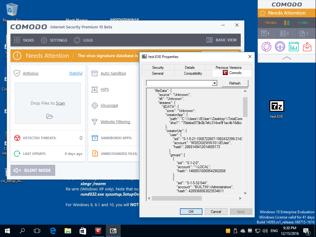 Главное — полностью переработана база данных. В ней больше нет места уязвимому 32-битному хешу, и сам формат ее изменился: вместо SQLite теперь используется внутреннее решение. Последнее, возможно, огорчит любителей поковыряться в базе своими руками:) Для их утешения введена специальная вкладка «Comodo» в окне свойств файлов: там в JSON-формате представлена различная информация о файле, включая и репутацию, и происхождение, и еще много чего интересного. Правда, эту вкладку могут удалить в финальном релизе, но понадеемся, что доступ к ней все-таки оставят.