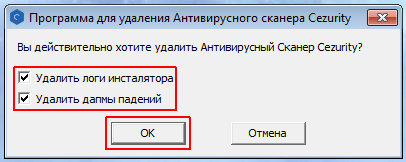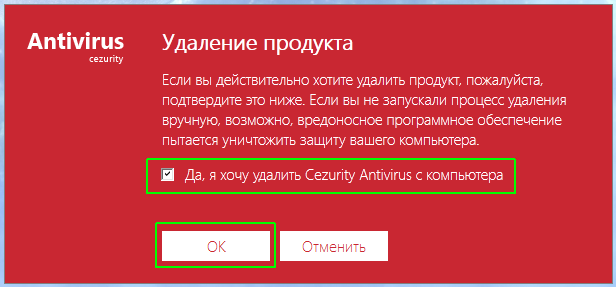 Если появится запрос на подтверждение, то отметьте пункт "Да, я хочу удалить Cezurity Antivirus с компьютера" и нажмите "OK"^