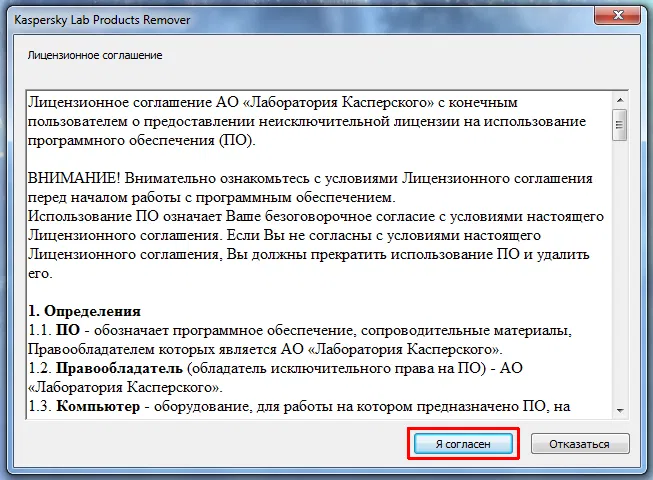 Запустите файл kavremover.exe, дважды щёлкнув по нему. Нажмите "Я согласен" для запуска утилиты: