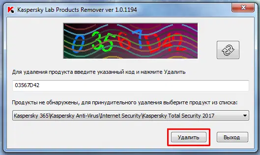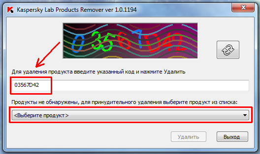Введите в поле защитный код, изображенный на картинке. Выберите продукт для удаления, если он не был определён автоматически, и нажмите "Удалить":