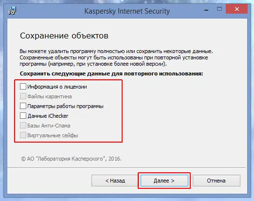 В окне "Сохранение объектов" будет предложено сохранить некоторые настройки и файлы антивируса. Если вы хотите удалить всё, то снимите отметки со всех пунктов нажмите "Далее":