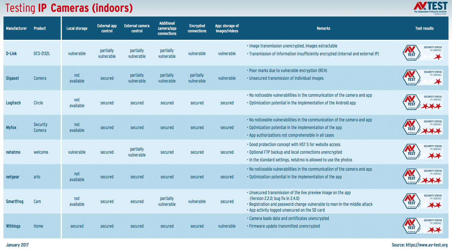 Следующая тестовая таблица показывает, какие IP-камеры получили положительный рейтинг по итогам проверки AV-Test. Тестирования устройств IoT регулярно публикуются на сайте лаборатории и в отдельном блоге.