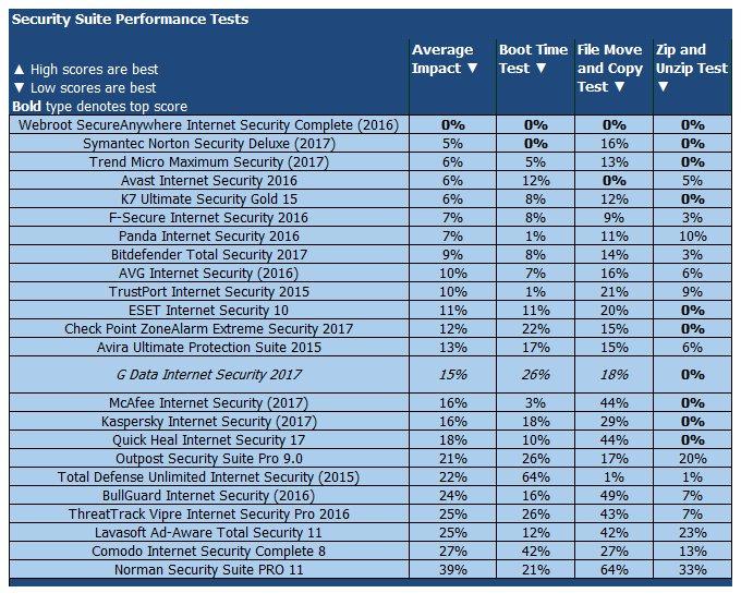 Хотя G Data не оказал серьезного влияния на производительность, некоторые продукты являются еще более легкими и не требовательными. Например, Webroot не оказал измеримого влияния ни в одном из трех тестов.