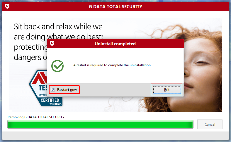 Дождитесь завершения удаления G Data с компьютера: