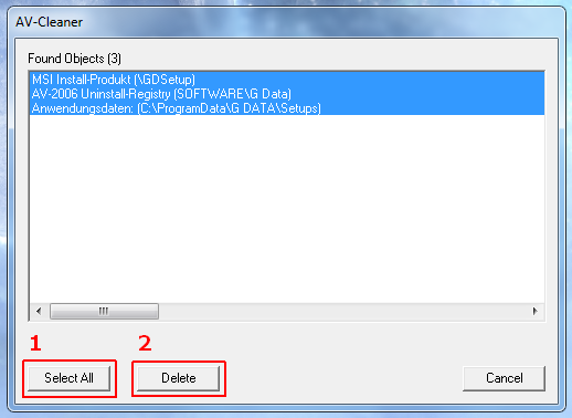 Запустите утилиту (файл AVCleaner.exe). Утилита покажет все остатки антивируса G Data. Нажмите кнопку "Select All" чтобы выбрать все пункты и затем нажмите "Delete":