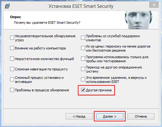 Если вам будет предложено указать причину удаления антивируса, отметьте её и нажмите "Далее". Результат ответа не повлияет на дальнейший процесс деинсталляции: