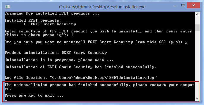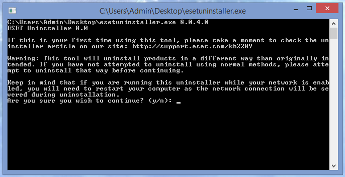 Например, для автоматического удаления всех продуктов ESET с перезагрузкой системы, используйте команду: ESETUninstaller.exe /force /reboot