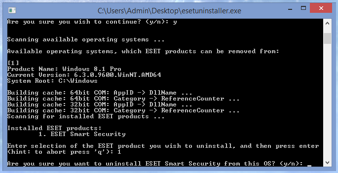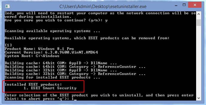 Утилита просканирует систему и покажет найденные программы ESET в пронумерованном списке. Выберите из списка установку ESET, которую вы хотите удалить, введя её номер и нажав ENTER. Обычно, утилита находит одну установку продукта ESET, которая будет в списке под номером 1: