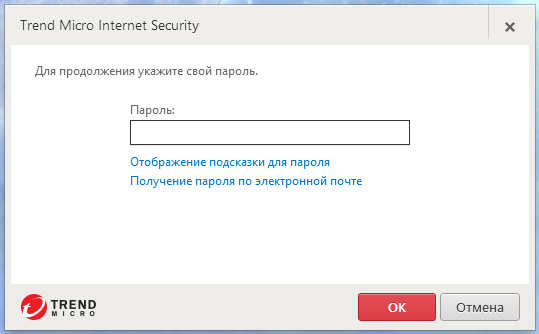 Примечание. Если настройки антивируса Trend Micro быле защищены паролем, то сначала, перед удалением, вам будет необходимо ввести установленный пароль. Если вы не помните установленный пароль, то воспользуйтесь ссылками в окне, для просмотра подсказки о пароле, или для отправки пароля на, указанный в настройках антивируса, адрес электронной почты: