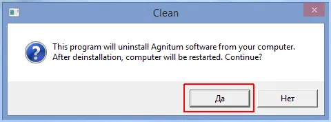 Скачайте утилиту для 32-х или 64-х битной версии Windows. Перезагрузите компьютер в безопасный режим Windows. Распакуйте скаченный архив и запустите распакованный файл clean.exe. В окне утилиты нажмите "Да" для запуска удаления: