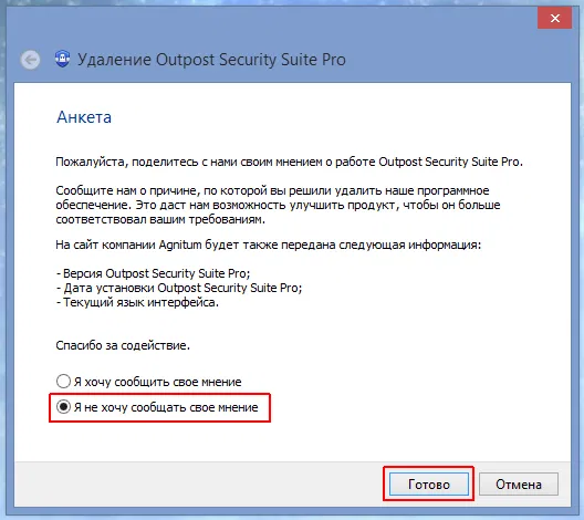 Во время удаления, вам будет предложено ответить на несколько вопросов. Ваши ответы не повлияют на процесс удаления. Также, вы можете пропустить этот шаг, отметив пункт "Я не хочу сообщать своё мнение" и нажав "Готово":