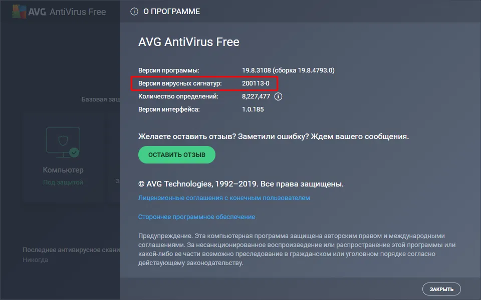 В информационной вкладке обратите внимание на версию вирусных сигнатур. По номеру версии, вы сможете узнать их дату выпуска. Он состоит из года, месяца, дня и порядкового номера баз за этот день (начинается с нуля). Например, версия 200113-0 означает, что вирусные базы выпущены 13 января 2020 года.