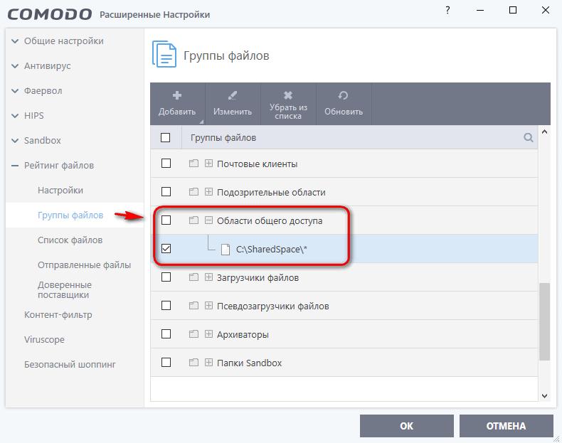 К каким именно файлам и папкам не будет виртуализироваться доступ, задается соответствующей опцией на вкладке Containment → Настройка Containment. По умолчанию они представлены группой Области общего доступа, в которую входит каталог загрузок в профиле пользователя, каталог избранного, а также каталог %PROGRAMDATA%\Shared Space. На мой взгляд, это не самые удачные местоположения. Рекомендую вместо них создать, например, папку SharedSpace в корне какого-либо диска и добавить ее в группу Области общего доступа (Рейтинг файлов → Группы файлов), а прочие записи из этой группы удалить.