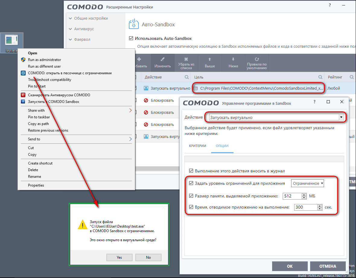 Для этого будет использоваться простейшая программа, которая запускает файл, указанный в ее аргументах командной строки. Понадобится скачать архив с программой (пароль cis), поместить программу в любое удобное место, добавить ее в доверенные и запустить — будет предложено добавить в контекстное меню проводника пункт COMODO: открыть в песочнице с ограничениями (его удаление выполняется повторным запуском). Программа написана на AutoIt3, в папке source прилагается исходный код и конвертер: в случае сомнений вы можете сгенерировать аналогичную программу, проверив ее код и подпись конвертера.