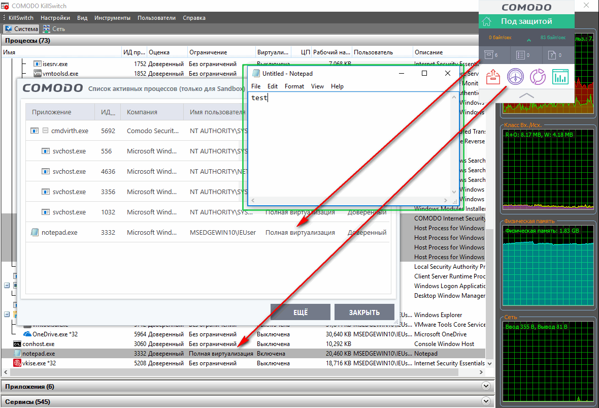 Обычно виртуализированные программы имеют зеленую рамку вокруг окна, однако гарантированный способ узнать о виртуализации — нажать в главном окне CIS индикатор Изолировано в Контейнере и найти программу в открывшемся списке активных процессов: в столбце Ограничение должно быть указано Полная виртуализация. Аналогичное можно увидеть в менеджере процессов KillSwitch.