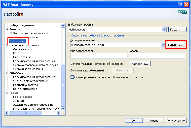 Откройте главное окно программы ESET, нажмите клавишу «F5» и перейдите на вкладку «Обновление». В строке «Сервер обновлений» нажмите «Изменить»: