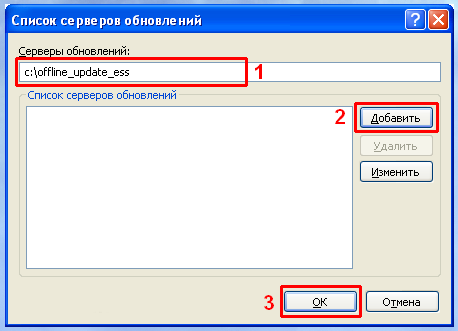 Откроется окно "Список серверов обновлений". В строке «Серверы обновлений» укажите путь к папке с обновлениями и нажмите «Добавить» и «OК».