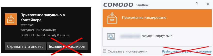 - оповещения, которые позволяют отказаться от изоляции, возможны только для программ-установщиков; изоляцию обычных программ предотвратить невозможно.