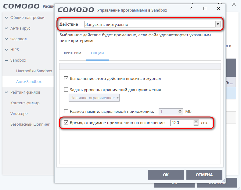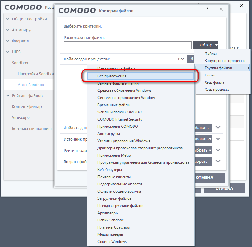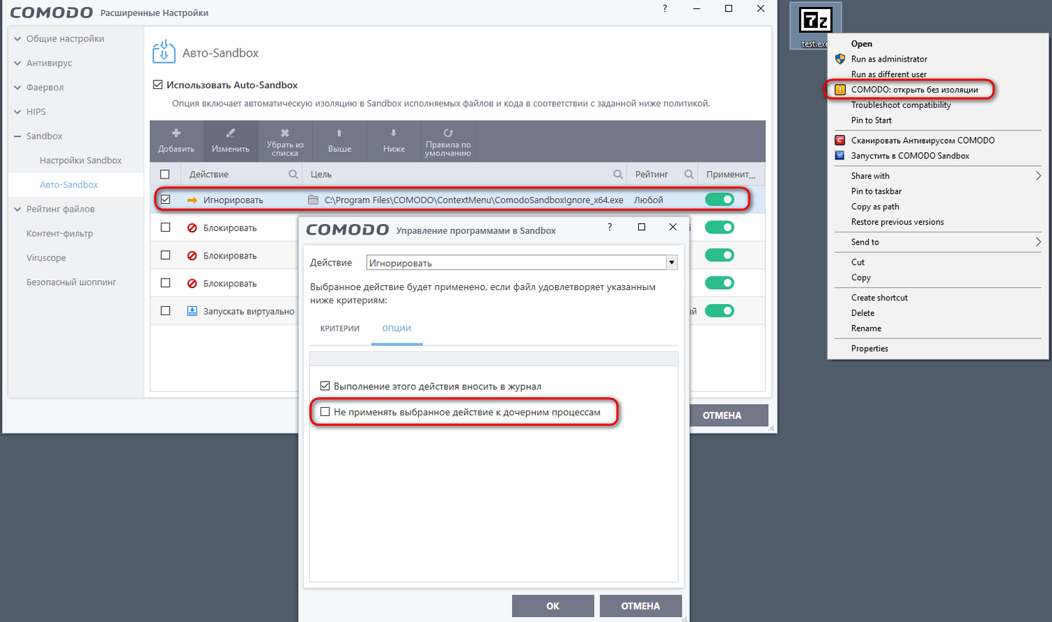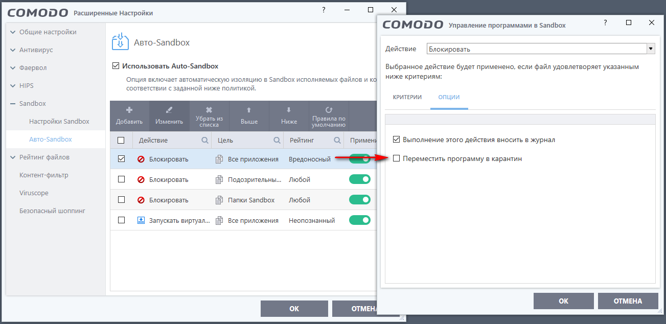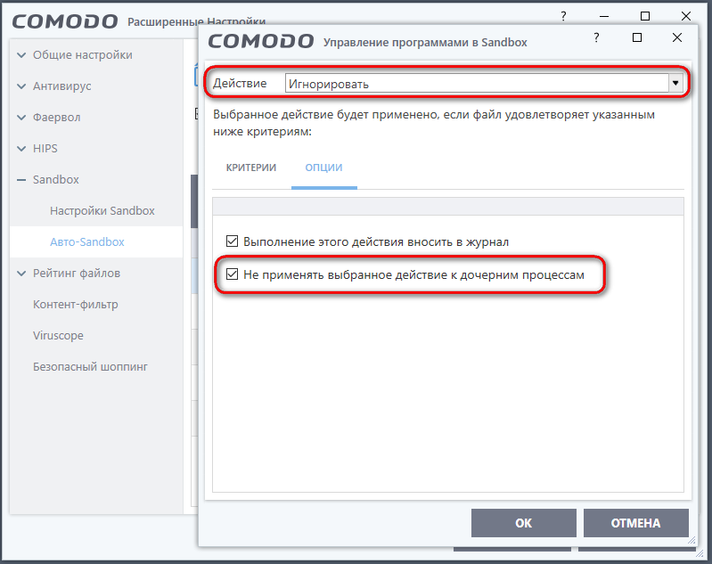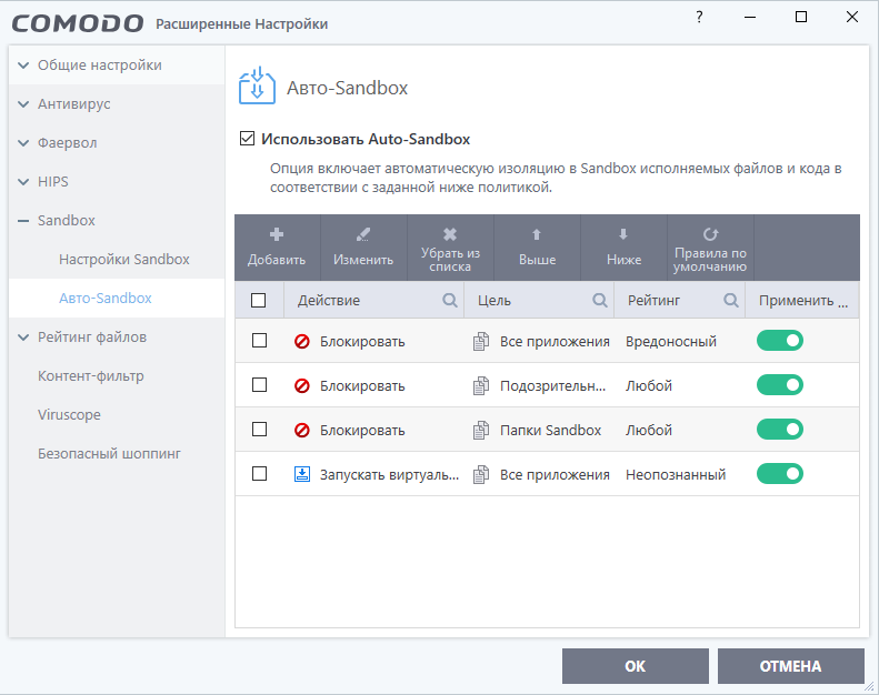 Также правила Auto-Containment не действуют на приложения, запускаемые в виртуальной среде COMODO.