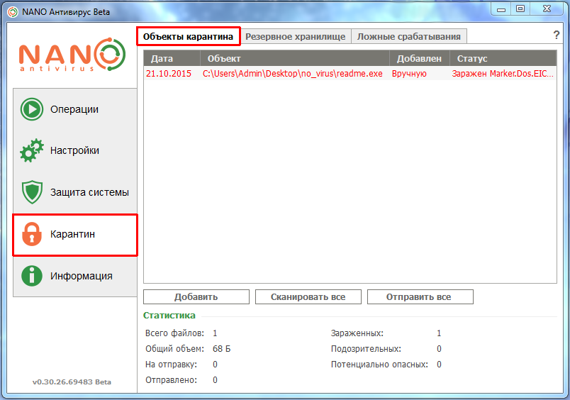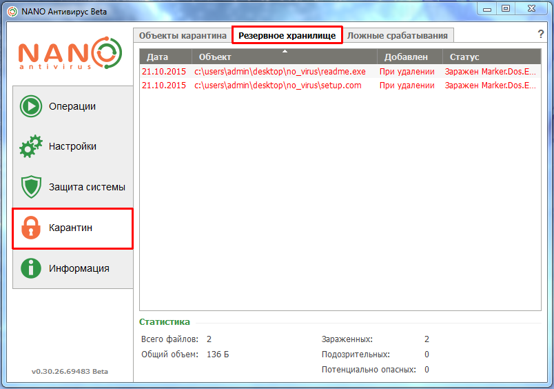 Если NANO Антивирус удалил какой-либо файл, который вы считаете безопасным, то его можно восстановить из карантина. Перед восстановлением, обязательно убедитесь что файл безопасен и получен из надёжного источника.