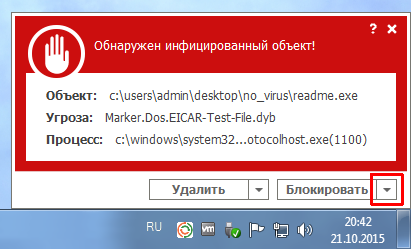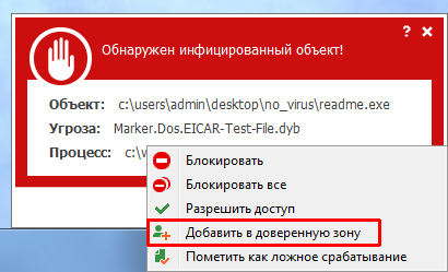 Когда файл будет восстановлен, возможно появление предупреждающего окна о том, что файл инфицирован. Чтобы подтвердить безопасность файла, щелкните по стрелочке в окне и выберите пункт "Добавить в доверенную зону":