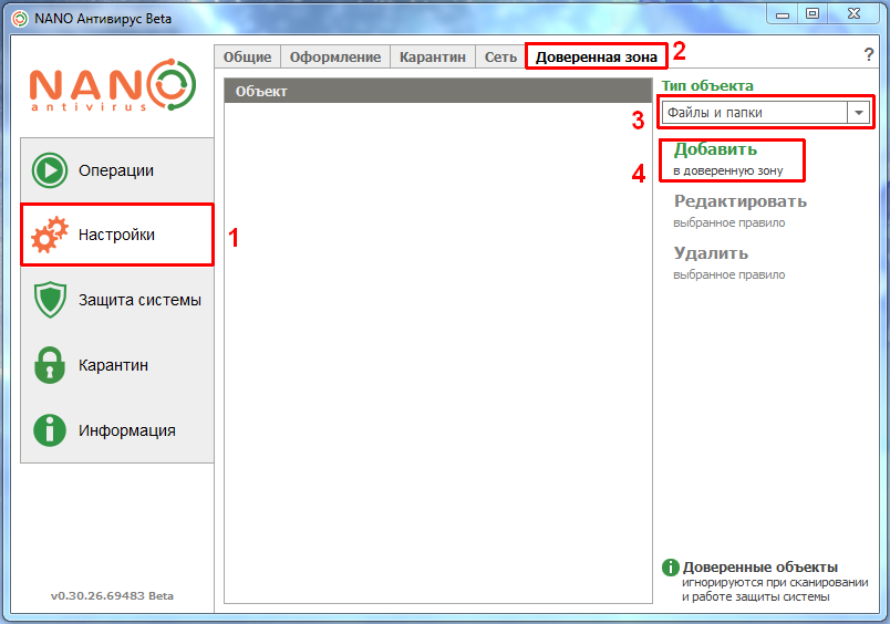 В NANO Антивирусе доступны три вида исключений: файлы и папки, программы и процессы, и интернет сайты. Добавить новые объекты, можно в меню "Доверенная зона". Для этого, в главном окне антивируса, в меню "Настройки", переключитесь на вкладку "Доверенная зона". В верху справа в поле "Тип объекта" можно выбрать категорию исключений. Затем нажмите кнопку "Добавить":