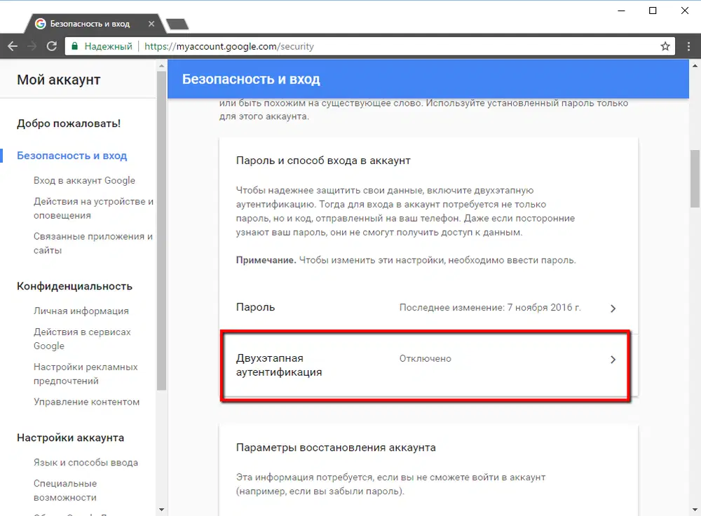 - В секции “Пароль и способ входа в аккаунт” выберите пункт “Двухэтапная аутентификация”.