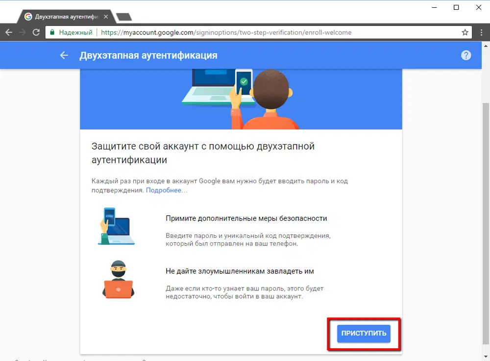 - Теперь вы можете настроить двухэтапную аутентификацию. Нажмите кнопку “Приступить”.
