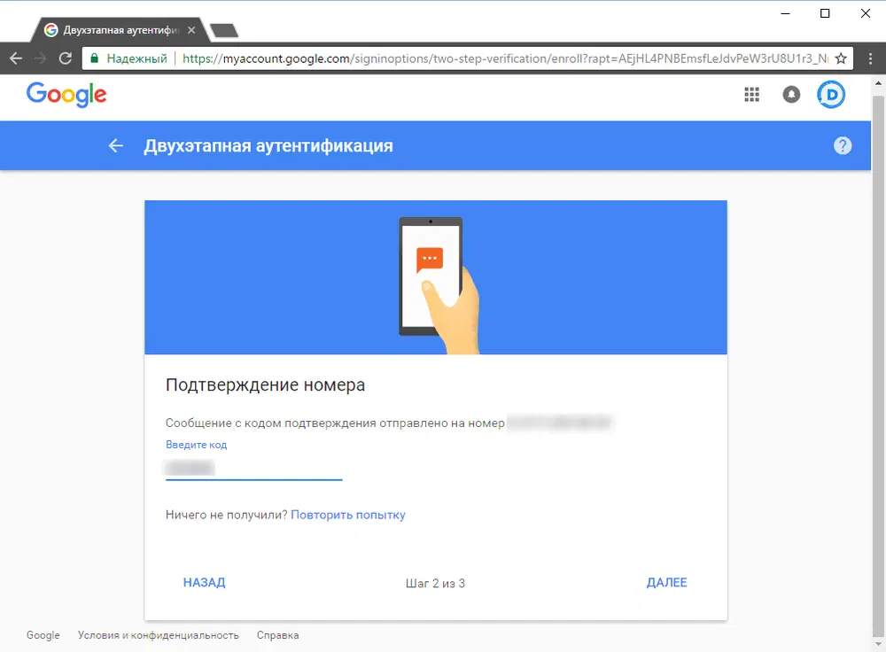 - Введите свой номер телефона. Вы сможете получать текстовые сообщения или телефонные звонки на данный номер. Выберите желаемую опцию и нажмите “Далее”.