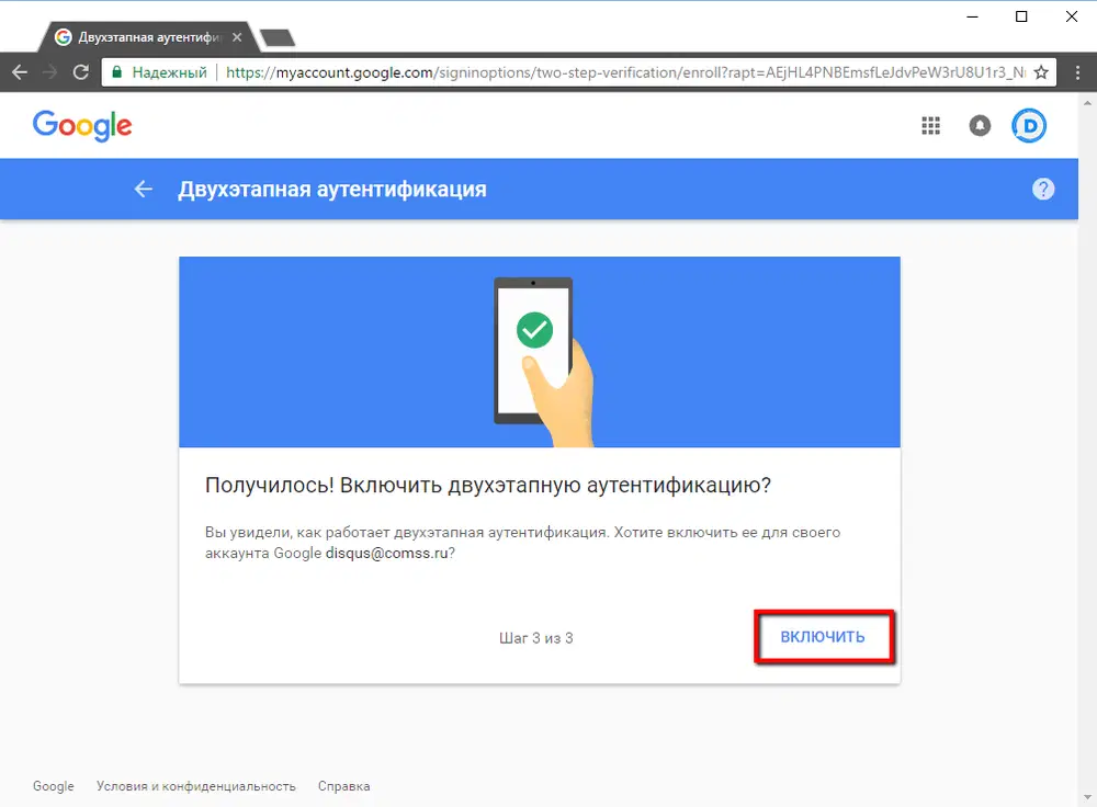 - После этого откроется следующая страница с сообщением “Получилось! Включить двухэтапную аутентификацию?”. Нажмите “Включить”.