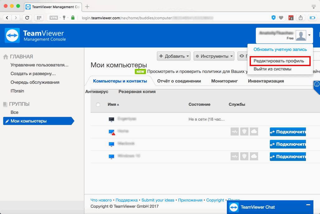 - Перейдите в веб-консоль по адресу login.teamviewer.com и выполните вход в ваш аккаунт. Вы увидите список компьютеров, к которым можно подключиться. В верхнем-правом углу экрана вы можете увидеть название вашего профиля, кликните по нему и в выпадающем меню выберите опцию “Редактировать профиль”.