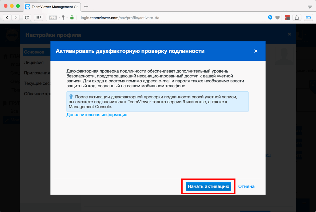 - TeamViewer в качестве второго фактора поддерживает работу только с приложениями-аутентификаторами. Отправка кодов на номер телефона не предусмотрена. Кроме того, двухфакторная аутентификация не работает с Teamviewer 8 и ниже. Нажмите “Начать активацию”.