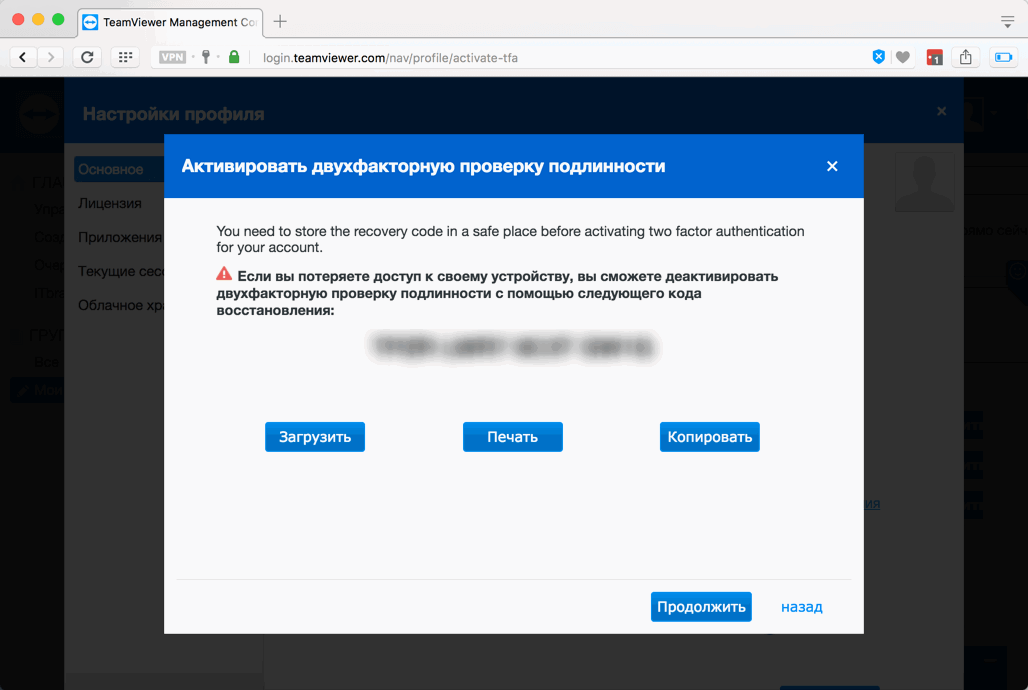 Примечание: если вы утратили доступ к мобильному устройству, то можете отключить двухфакторную аутентификацию с помощью кода восстановления, перейдя по ссылке https://login.teamviewer.com/#deactivate-tfa. Введите адрес электронной почты и пароль от вашего аккаунта TeamViewer, затем введите код восстановления, полученный при активации и нажмите кнопку “Деактивировать”. Если вы потеряете доступ к коду восстановления и мобильному устройству, то восстановить доступ к аккаунту не получится.