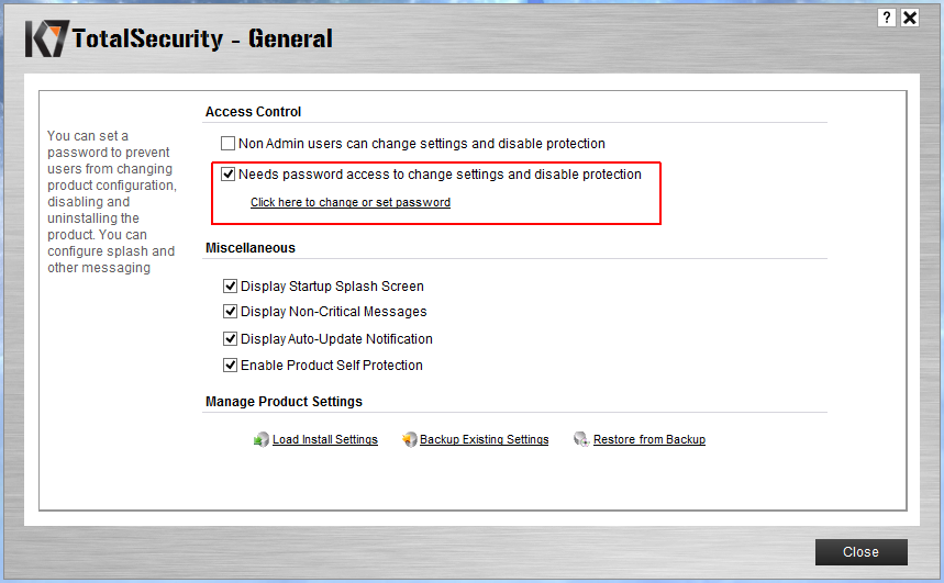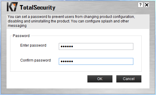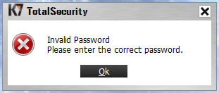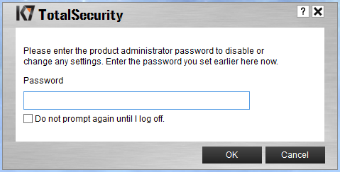 Если в антивирусе K7 включена защита паролем, то для отключения защиты или удаления антивируса, необходимо ввести пароль. В этом случае, появится окно с сообщением "Please enter the product administrator password to disable or change any settings. Enter the password you set earlier here now." и с полем для ввода пароля: