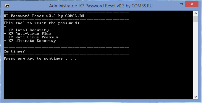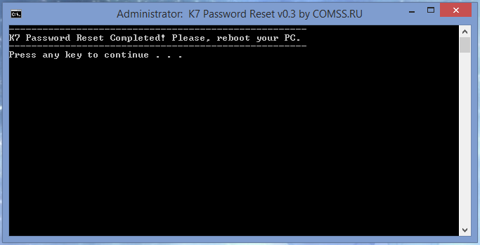 Загрузите Windows в Безопасном режиме. Распакуйте архив и запустите файл k7_pass_reset.bat. Затем, нажмите любую клавишу для запуска скрипта.