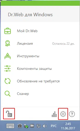 Для установки пароля в антивирусных продуктах Dr.Web версий 10 и 11, щелкните по значку Dr.Web в системном трее, разблокируйте "замок" и щёлкните по значку "шестерёнки":